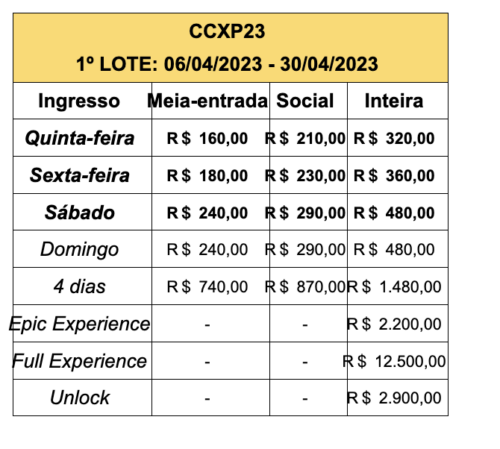 Após o anúncio das datas oficiais do evento, a CCXP23 revela os valores do primeiro lote de ingressos. O público poderá escolher entre as oito modalidades tradicionalmente disponibilizadas: Quinta, Sexta, Sábado e Domingo; o pacote de Quatro Dias; o EPIC Experience, FULL Experience e o Unlock. Os ingressos EPIC Experience, FULL Experience e Unlock contam com benefícios exclusivos e possuem uma oferta limitada. As vendas acontecem a partir do dia 06 de abril, às 12h, no site oficial da CCXP.