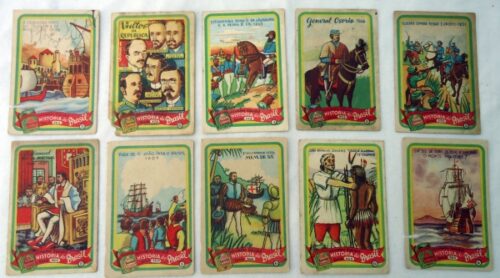 Para quem não sabe, essas estampas eram feitas de papel-cartão, e cada ficha apresentava o formato seis centímetros por nove, frente e verso. Os temas eram bem variados e de cunho informativo. Eram verdadeiras aulas. Infelizmente, por volta dos meus 9 anos, essas estampas não mais circulavam. Segundo pesquisadores, elas duraram 27 anos, de 1930 a 1957. As primeiras séries foram “A vida de Santos Dumont”, “Episódios Nacionais”, “Produtos do Brasil”, “Cachoeiras do Brasil” e “Aves do Brasil”, que se intercalaram com outros temas de âmbito mundial, como “Dom Quixote” e “Compositores Célebres” – entre os destaques, o maestro e compositor brasileiro Carlos Gomes.