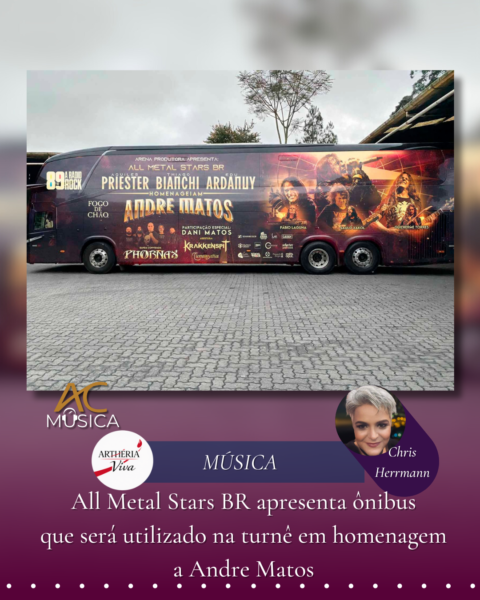 A cena do heavy metal nacional viverá um momento histórico em março de 2026 com a chegada da turnê “All Metal Stars BR – Homenagem a Andre Matos”. Para marcar visualmente essa jornada pelas estradas brasileiras, um ônibus temático foi apresentado, estampando os rostos e a energia dos músicos envolvidos nessa grandiosa celebração. A arte estampada no ônibus foi desenhada por Carlos Fides e João Duarte.
