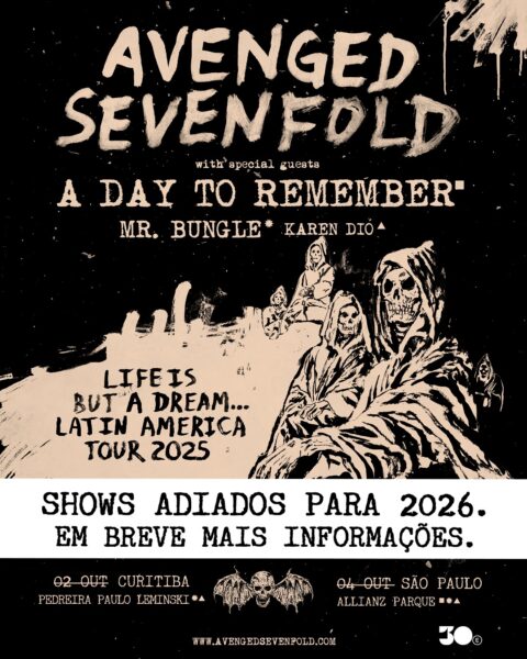 Com muito pesar, a banda norte-americana Avenged Sevenfold anunciou o adiamento de toda a sua turnê na América do Sul, originalmente prevista para este ano. A decisão foi tomada devido a um hematoma nas cordas vocais do vocalista M. Shadows, condição que exige repouso absoluto para evitar danos permanentes à voz.
