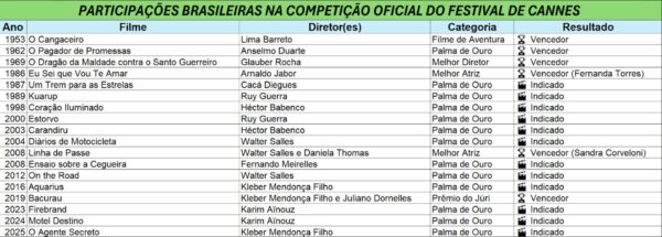 Pela terceira vez, o diretor Kleber Mendonça Filho será o representante do Brasil na corrida pela Palma de Ouro, prêmio máximo do festival de cinema de Cannes, na França. Mas o país já acumula pelo menos 6 vitórias nas categorias principais das competições do evento, além de prêmios nas mostras paralelas.