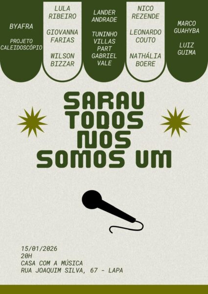 O movimento de artistas “Todos Nós Somos Um” (@todosnossomosum) realiza o seu primeiro sarau em 2026 no ponto de cultura Casa com a Música (@casacomamusica), na Lapa, no dia 15 de janeiro, quinta-feira, às 20h. Será uma noite muito especial marcada pela homenagem à cantora e compositora Giovanna Farias (@giovannafarias.uyraplural), filha do lendário compositor e cordelista paraibano, Vital Farias (@vitalfarias.oficial).