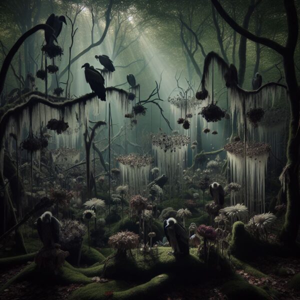 No coração de um campo abandonado, onde o vento carregava murmúrios de histórias esquecidas, havia um jardim de flores murchas cujas pétalas pendiam como lágrimas congeladas. Entre elas, urubus pousavam, olhos brilhantes como espelhos negros que refletiam a decadência ao redor. Na parte mais baixa do jardim, um ser decaído emergiu do meio das flores. Vestia roupas rasgadas, que flutuavam como bandeiras de um reino perdido. Seus passos lentos constituíam uma luta contra o peso do mundo. Nas mãos, carregava um espelho quebrado. Cada fragmento refletia pedaços de um rosto que não pertencia a ninguém. Juízes de um tribunal imaginário, os urubus observavam em silêncio. O ser parou diante de uma flor baça, suas raízes se agarravam ao solo como dedos desesperados. Ele ergueu o espelho, tentando encontrar algo além do vazio. Mas o que viu foi um desfile de imagens: rostos distorcidos, risos que se transformavam em gritos, olhos que choravam sangue.