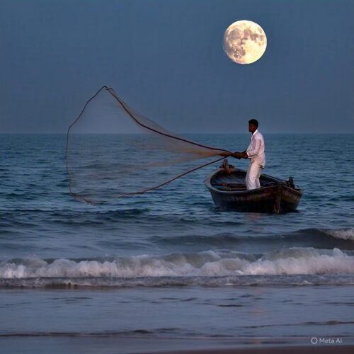 O marinheiro lança redes no mar, movimentos ritmados pelo balanço do barco. Ondas vêm e vão, trazendo consigo a memória de naufrágios antigos e de tesouros perdidos. A Lua subia no horizonte, iluminando cardumes que cintilavam embaixo do espelho d’água. De repente, uma criatura emergiu. Não era peixe, nem lenda, simplesmente algo esquecido pelo tempo. O estranho ser apenas olhou para o homem e depois mergulhou, sumindo nas profundezas. O marinheiro ficou ali, redes vazias e olhos cheios de mistério. O mar nunca entrega tudo.