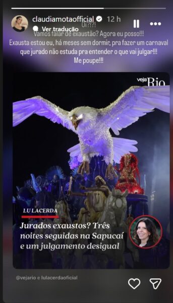 “Vamos falar de exaustão? Agora eu posso!! Exausta estou eu, há meses sem dormir, para fazer um carnaval que jurado não estuda para entender o que vai julgar!!! Me poupe!!!”