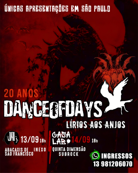 Repetindo o sucesso dos sold outs no Sesc Avenida Paulista no ano passado, a Dance of Days esgotou novamente duas datas neste fim de semana no Sesc 24 de Maio, durante as celebrações do Dia do Rock, e já anuncia, para setembro, duas apresentações especiais na capital para celebrar os 20 anos do aclamado álbum Lírios aos Anjos — um verdadeiro divisor de águas em sua trajetória. Os shows acontecem nos dias 13 de setembro (sábado), no Jai Club, e 14 de setembro (domingo), na Casa Lab.