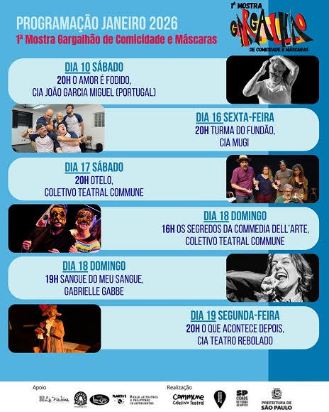 De 16 a 25 de janeiro acontece a 1ª Mostra Gargalhão de Comicidade e Máscaras no Teatro Commune. A mostra começou no dia 10 com a apresentação da peça portuguesa O Amor é Fodido. Ao todo serão 13 espetáculos de 10 artistas e companhias de teatro: Cia João Garcia Miguel, Cia Mugi, Coletivo Teatral Commune, Cia do Vale, Cia. Duo Dégua, Cia Teatro Rebolado, Cia Peixe Vagalume, Circo Herolino, Grupo Fora de Hora, Cia Metamorfose de Teatro, e os artistas Gabrielle Gabbe e Surya Marielle.