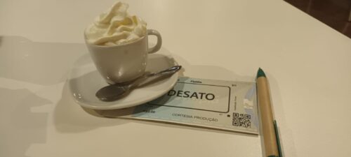 Chego exatamente às 18:30, com tempo para um papo, uma foto, um cappuccino e uma percepção do ambiente. Combino com Mari, amiga querida, também psicanalista e poeta, que está a caminho.