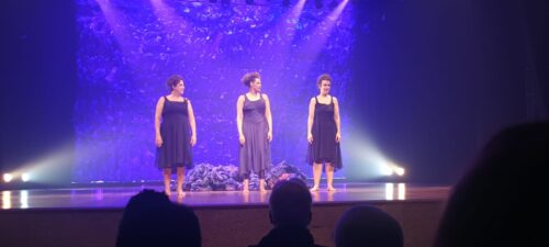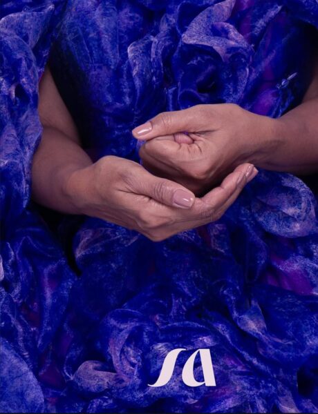 O palco nos abraça no lilás, no espaço do sagrado, no feminino, por dentro e por fora.