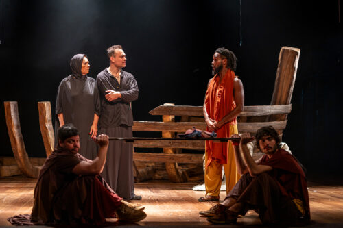 O cenário, assinado por Mauro Vicente, também impressiona: sofisticado e distinto, reproduz a estrutura de um navio — transporte amplamente utilizado no Oriente Médio por aqueles que fogem do próprio fim.