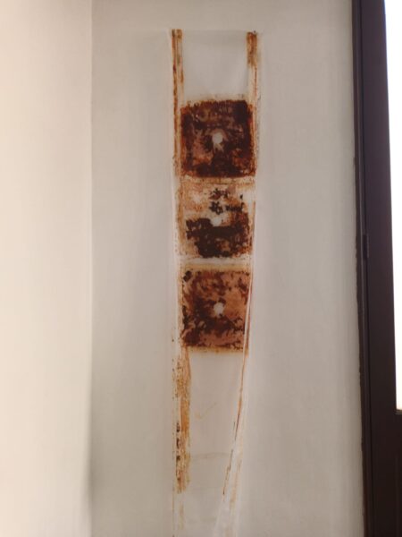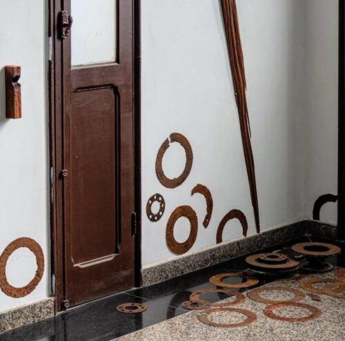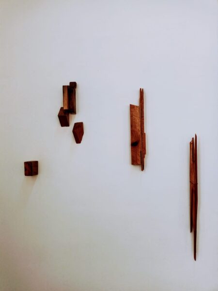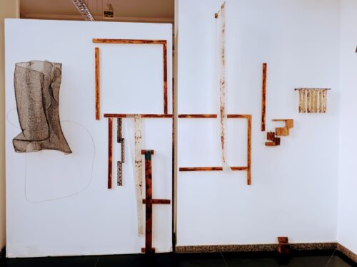 Há cerca de dois anos estou debruçada sobre o projeto. Como pode perceber é uma instalação, em seus objetos e desdobramentos, a qual chamei de Andante. As peças se complementam e dialogam, ocupando espaços, trabalhando interferências, vãos, objetos, histórias, marcas e memórias. O que é descartado é ressignificado, fazendo parte de uma nova forma de contar e estar no mundo.Repare, por exemplo, nessa peça: ela é um “gabarito”, uma base de uma casa demolida. Eu a nomeei de Labirinto. Ela tem uma estrutura rígida, suas marcas, construções e desconstruções. A peça a seguir (sim, é um engendramento) ja tende a suavizar tal rigidez, tanto na disposição, como no material, trazendo uma leveza. São os diálogos subjetivos, poéticos em nossa vida cotidiana, onde há os pesos, as complexidades e dicotomias, mas também há a brisa, a leveza, a poesia, inerente à nossa existência…