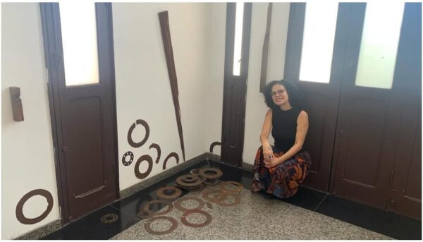 Ligia Calheiros e a obra “Engrnagem Vital”, que é parte da instalação-exposição Andante.