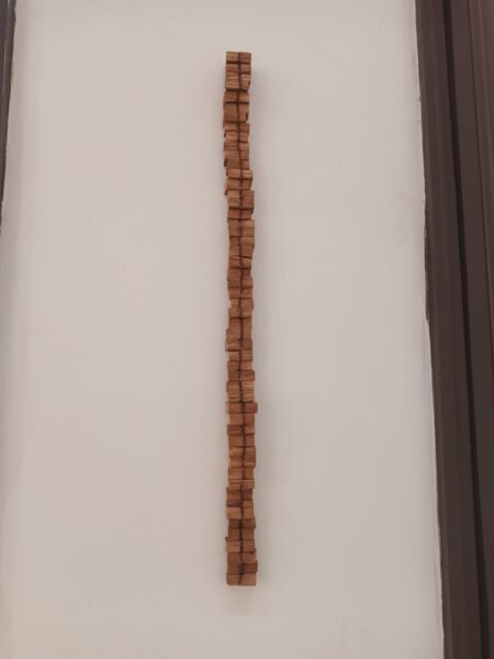 LC – Mais adiante chegamos ao processo com as madeiras que conversam entre si: madeiras que trazer registros de números, marcas e suas cicatrizes, irregulares e sobrepostas. Há um elo, mas cada um tem sua singularidade, parafraseando a própria vida…
