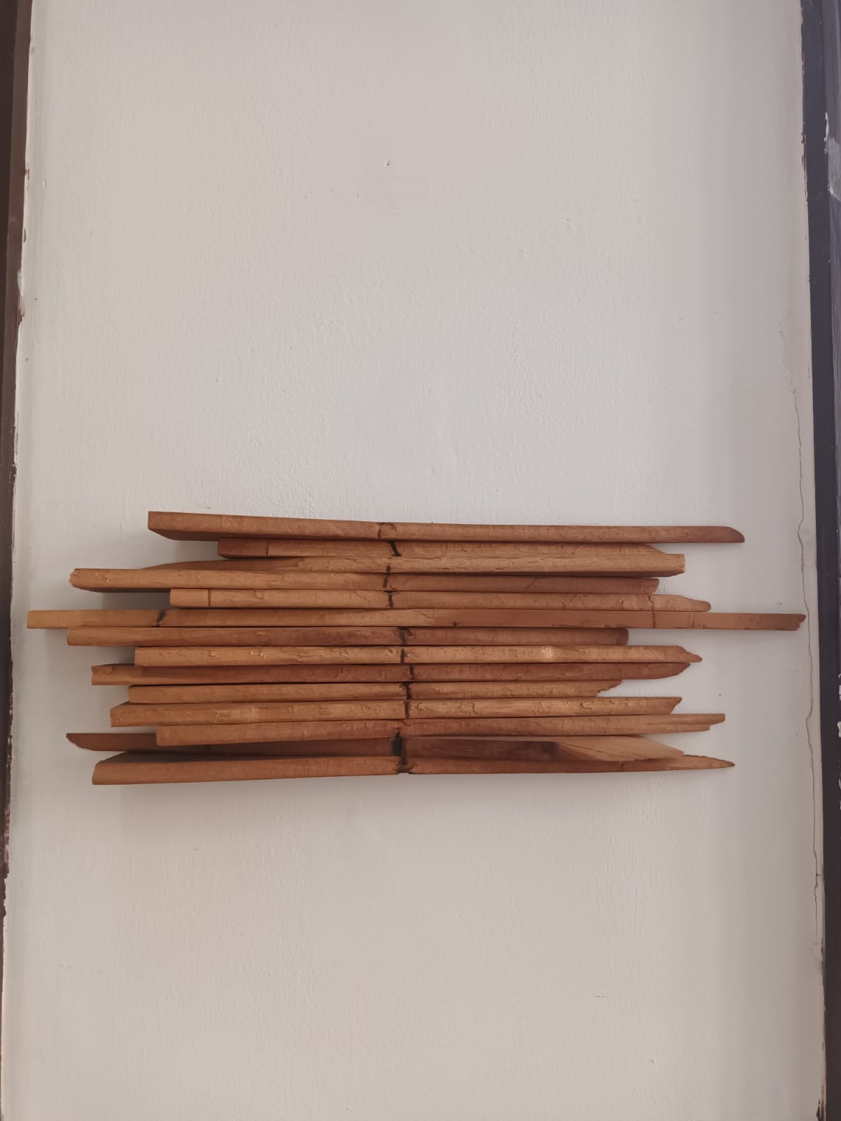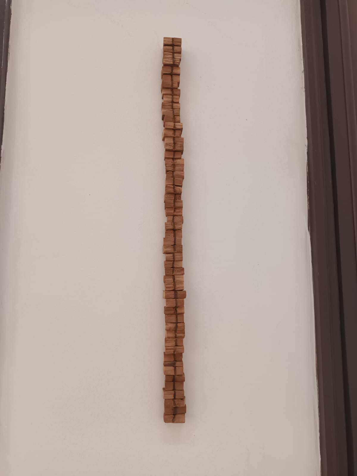 LC – Mais adiante chegamos ao processo com as madeiras que conversam entre si: madeiras que trazer registros de números, marcas e suas cicatrizes, irregulares e sobrepostas. Há um elo, mas cada um tem sua singularidade, parafraseando a própria vida…