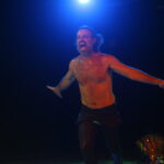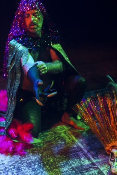 “Durante o desenvolvimento do CASA COMUM, vivendo uma residência artística de um mês na Amazônia — entre rios, florestas e cidades —, atravesso uma navegação de um dia inteiro com o povo Sateré-Mawé. É nesse estado de escuta profunda, entre o real e o mítico, que surge o insight: a Cuca. Não como a figura do medo infantil, mas como um visage, uma ponte entre mundos, entre o planeta e o universo mágico do carnaval, como um possível lugar de fala. Dessa forma, para mim, ela passa a encarnar o espírito do carnaval da Estação Primeira de Mangueira — território simbólico afetivo de onde posso puxar o fio das mulheres da minha família, convocar minha avó pernambucana, acessar uma linhagem ancestral feminina e, a partir daí, dialogar com minha filha sobre o futuro que se constrói no agora. A Cuca se materializa pela primeira vez em 2024, no Carnaval do Rio de Janeiro, como figura do carnaval de rua carioca, desfilando nas ruas da cidade pelos arredores da Sapucaí e durante o cortejo do Cordão do Boi Tolo. Ao se trajar de Verde e Rosa, ela carrega as cores do lugar onde cresci, o Maracanã. Minha avó morava perto da Mangueira; essa relação é antiga, afetiva, estrutural. Essa é a Cuca ancestral. Ao encarná-la, invoco minha avó, invoco as mulheres que me antecedem, para falar com Julieta — e falar do mundo. A cada aparição, acompanhada por videomaker e fotógrafa, a Cuca gera material audiovisual e se transforma. Ela é pesquisa viva. Troca de pele. No segundo ano, surge em vermelho: cor do amor de pai para filha, mas também do sangue, da encruzilhada, da escuta e do movimento. A cor de Exu, o dono do carnaval, aquele que pede licença, que abre caminhos, que governa o carnaval e permite a travessia entre mundos. E ela desfila no cortejo do Bloco Tecnomacumba, da artista Rita Benneditto, além de participar também do desfile do Cordão do Boitatá. Esse projeto, que transborda para múltiplas linguagens, encontra finalmente sua forma como uma performance transmídia no Futuros – Artes e Tecnologia, um lugar profundamente ligado à minha trajetória. Voltar ao Futuros para estrear A Cuca tem, portanto, uma dimensão simbólica e afetiva profunda. É a inauguração da Cuca na cena contemporânea carioca, como um espetáculo. É também meu retorno aos palcos como ator, depois de quase quinze anos — meu primeiro solo. Nada poderia ser mais apropriado do que fazê-lo nesse espaço onde arte, tecnologia, memória e futuro se cruzam. Afinal, no fundo, tudo começa — e continua — tentando responder à mesma pergunta: que mundo estamos deixando para quem vem depois? A Cuca, é também sobre celebrar a vida que é passada de geração a geração e a existência. Sobre viver, trocar de pele e gestar mundos. É sobre a responsabilidade de abrir os caminhos pros que vem depois, ocupar os espaços, exaltar a alegria e o amor. Sobre pulsão de vida, beleza, poesia e carnaval. É sobre também reinventar memórias e habitats, e refundar uma sociedade mais igualitária e empática. O projeto se dá em campo expandido e ampliado, esgarçando visões e tensionando lugares pré-estabelecidos.”