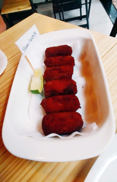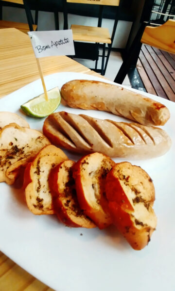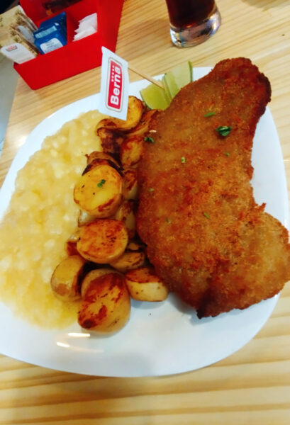 Enquanto degustava minha cerveja, com calma, vi sair da cozinha em direção a uma mesa vizinha o famoso joelho de porco. O prato estava lindo! Porém, era enorme e eu, certamente não daria conta. Resolvi ser mais comedido e, pra abrir os trabalhos, pedi uma porção de croquete alemão e uma de Salsichão Kalbsbratwurst (carne de vitela e suína). Depois, fui de Wienerschnitzel, um filé suíno empanado com purê de maçã e batata rosti – que foi trocada por uma batata rústica, pois estavam em falta naquele dia.