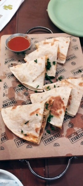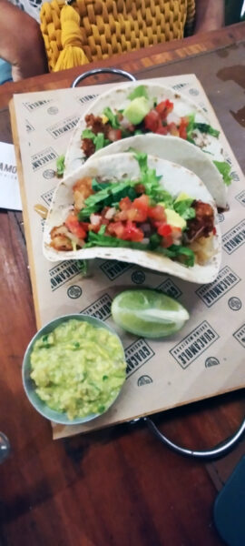 Depois vieram uma quesadilla de frango desfiado, bacon e queijo e uns tacos recheados de frango crocante, queijos mistos, rúcula, pico de gallo e cubos de abacate, finalizados com geleia de abacaxi com pimenta e acompanhados de guacamole.