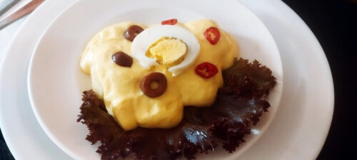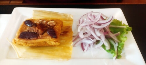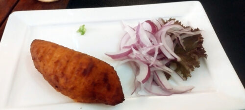 Conheci três entradas típicas servidas no restaurante: Papa Rellena, um bolinho de batata recheado com carne picada, ovos, azeitonas e salsa criolla; Tamal, típicas pamonhas de milho temperadas, recheadas e acompanhadas de salsa criolla; e Papa a la Huancaina, rodelas de batata cozidas, cobertas com leve creme de queijo com aji peruano, ovo e azeitona.