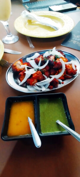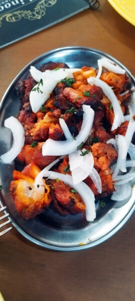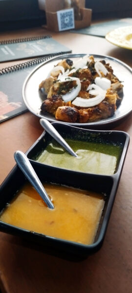Pedi um Tandoori Chicken Tikka, um frango marinado com iogurte caseiro, gengibre e temperos, assado no forno indiano Tandoor, acompanhados de molho de manga e de hortelã com coentro e de um Butter Naan.