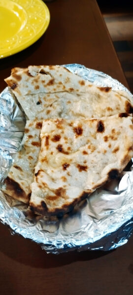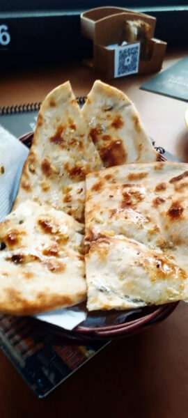Depois, pra complementar, pedi um Chicken Lasooni Tikka, frango marinado com iorgurte caseiro, bastante alho, gengibre e temperos, também assado no forno indiano Tandoor. Além dos molhos, que já acompanham os pratos, pedi também um Cheese Garlic Kulcha, um pão indiano com recheio de queijo e alho picado por cima.
