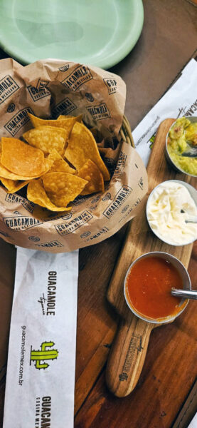 O restaurante da vez é o GUACAMOLE (@guacamolemex), na sua unidade situada no New York (BarraShopping), uma casa com decoração bastante imersiva. Lógico que, como toda pessoa que vai a um restaurante mexicano, a abertura dos trabalho se dá com uma tequila. E, aqui, ela pode ser servida de duas formas: com ou sem emoção… Fiquei curioso e me atrevi a pedir com emoção e ela veio: depois de virar o shot inteiro da tequila e mandar pra dentro o abacaxi misturado na canela, o garçom veio e chacoalhou a minha cabeça dez vezes. Certamente fiquei meio atordoado, né? Tanto que a segunda dose resolvi beber da forma tradicional, mais lentamente, acompanhado de sal e limão…