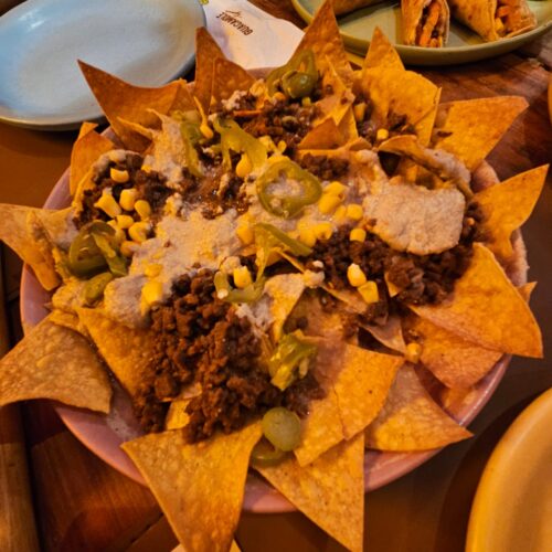 Consultando o cardápio, vi que o restaurante segue uma tendência, apresentando várias opções veggies. Entre elas, experimentei o Nacho Veggie Caliente – tortillas chips da casa coberta de frijoles, chili vegano, creme de milho, azeitona preta, milho verde, pimenta jalapeño, pimenta biquinho e coentro, acompanhado de queijo a base de girassol, pico de gallo e guacamole.