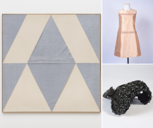 Obra “Armadura”, de Paulo Roberto Leal (1946-1991) – Cortesia Galatea. Foto: Ding Musa; Vestido de tafetá bordado Jean Patou, Paris, anos 1960. Acervo Casa Museu Eva Klabin; Casquete Rose Valois. Acervo Casa Museu Eva Klabin