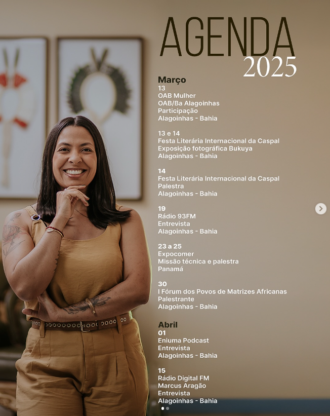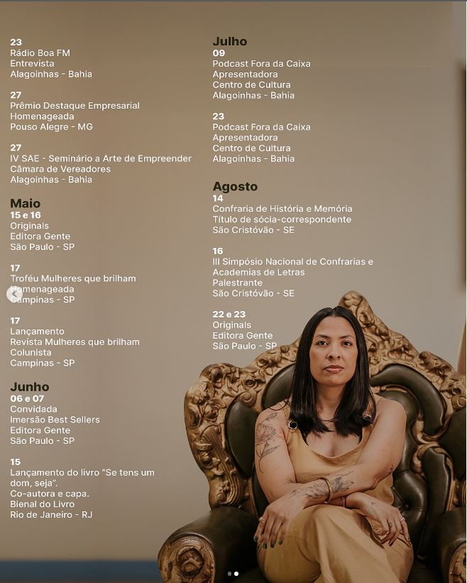 Além de seu compromisso no Panamá, Géssica tem sido uma presença requisitada em diversos eventos em todo o Brasil. Em janeiro, esteve em Alphaville; em fevereiro, visitou Curitiba, Salvador e Pedrão; e em março e abril, participará de uma série de eventos em Alagoinhas. O calendário de palestras segue recheado, com agendas em Campinas, na Bienal do Livro do Rio em junho, no Congresso de Vendas em São Paulo em agosto, e também em Sergipe.