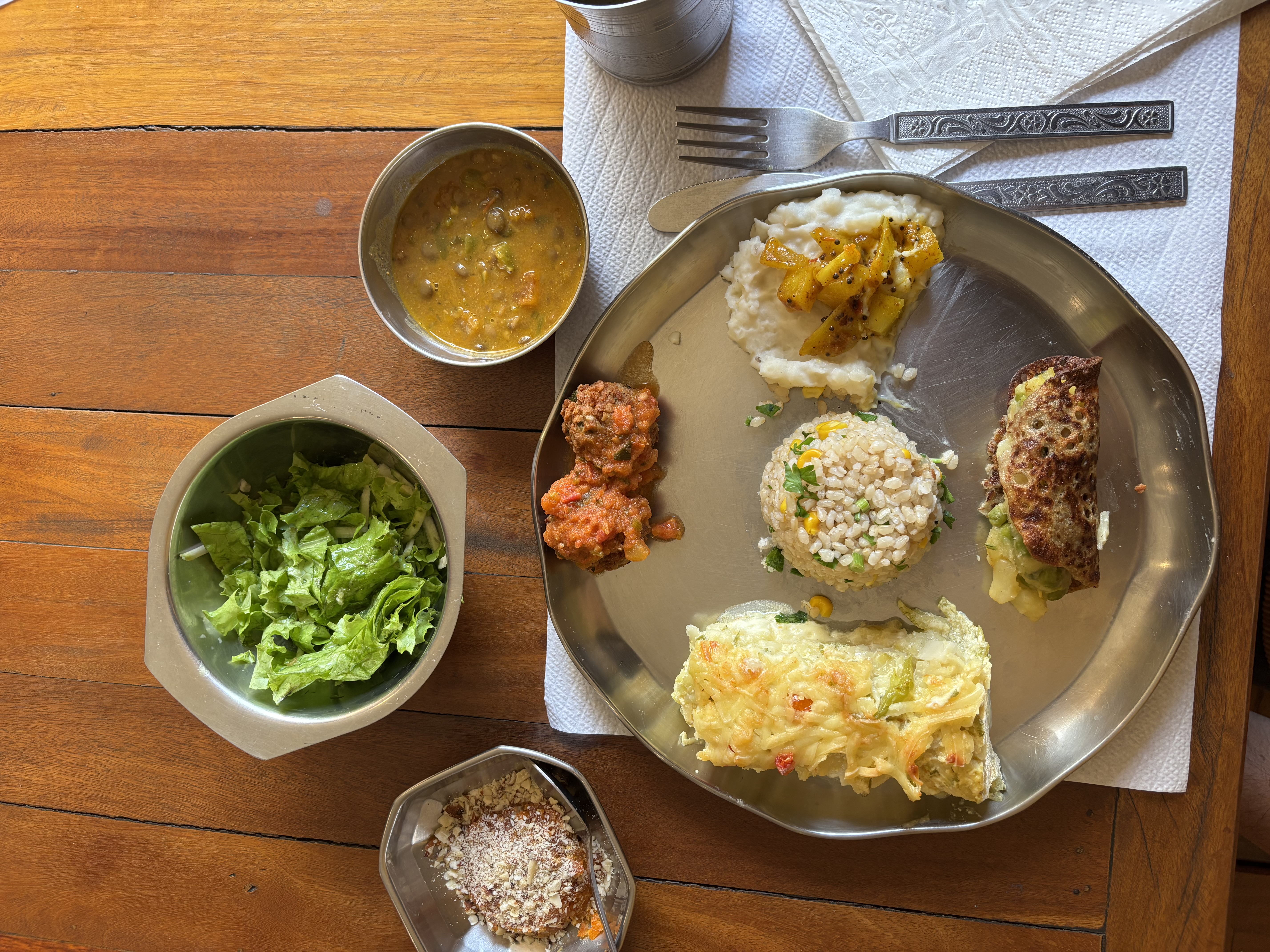 Servidos sempre com salada, sobremesa e suco à vontade, os pratos são pensados para oferecer uma refeição completa — tanto em nutrição quanto em sabor. Quem visita o Gopala encontra opções vegetarianas e veganas que não abrem mão da criatividade e do afeto na cozinha.