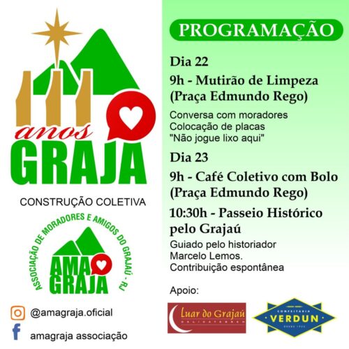 “Pensamos numa programação gratuita e democrática, onde todos os moradores pudessem participar, como o mutirão de limpeza. Para este evento, basta trazer uma vassoura, pá (especialmente com cabo), luvas, sacos de lixo, garrafas pet com água, sabão em pó e/ou desinfetante. Sairemos pelas vias verificando as ruas mais sujas. Queremos também convidar os grajauenses a trazer suas demandas para a associação de moradores, tomar seu café da manhã conosco, comer um pedaço de bolo e ouvir histórias maravilhosas sobre o bairro em que moram, conhecendo-o melhor”, afirma Ilan Wettreich, presidente da AMAGRAJA.