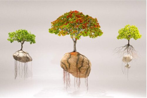 Essa fusão entre natureza e cultura constitui a espinha dorsal de sua pesquisa. Nas obras, raízes expostas revelam aquilo que nos ancora, ilhas pairam no ar como territórios afetivos, árvores solitárias se tornam portais entre mundos. Ao recriar a paisagem de sua terra natal como corpo espiritual, o artista anuncia a natureza como força divina, origem e sustentação de tudo aquilo que chamamos de cultura.