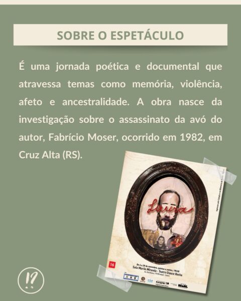 Em cena, o artista evoca a figura de sua avó — Laura — não para construir uma biografia linear, mas para abrir um espaço de escuta e invenção, onde lembranças e silêncios ganham corpo e voz. O espetáculo, de forte dimensão poética e afetiva, transforma uma ausência em presença, uma tragédia em encontro e uma história silenciada em ato compartilhado.