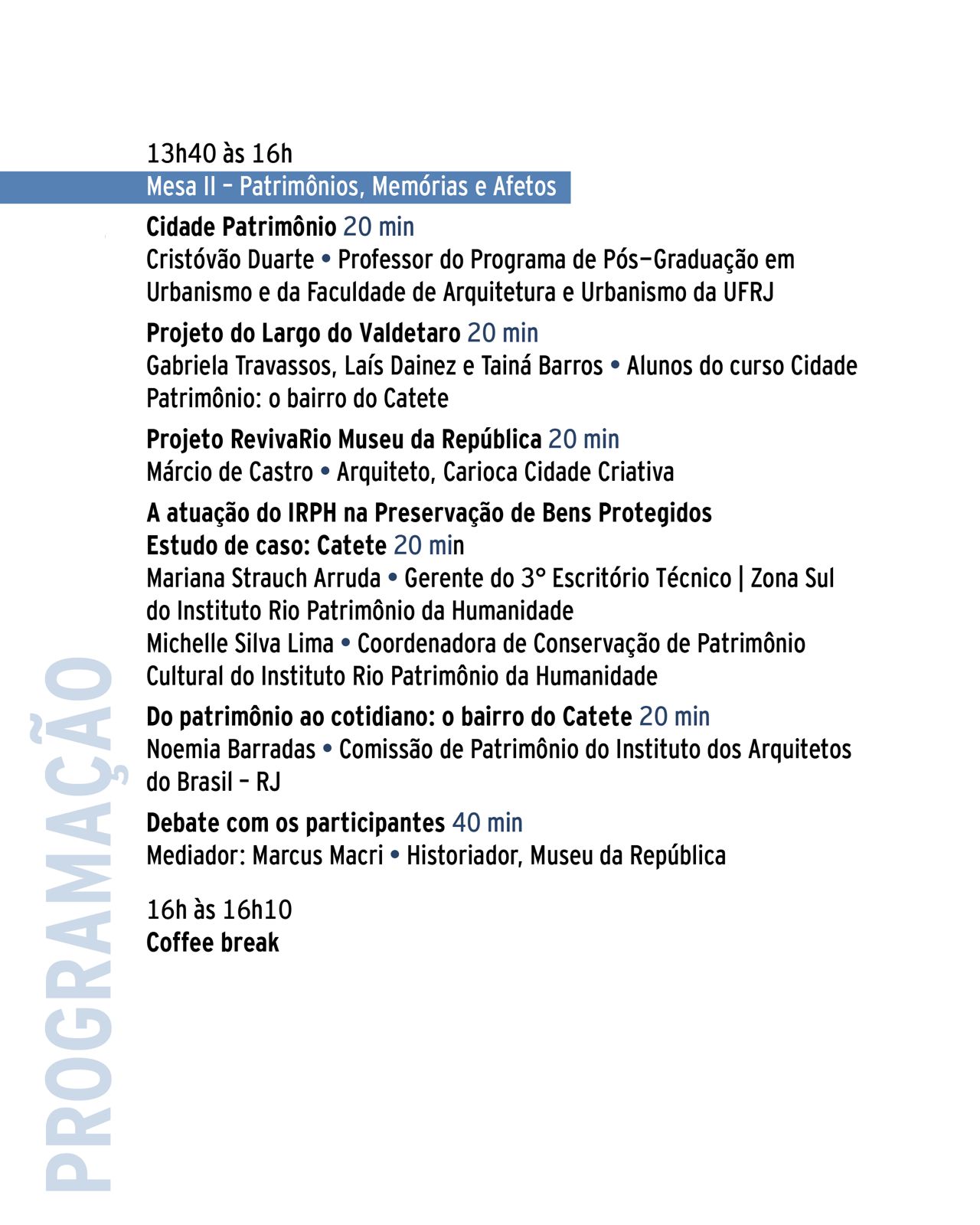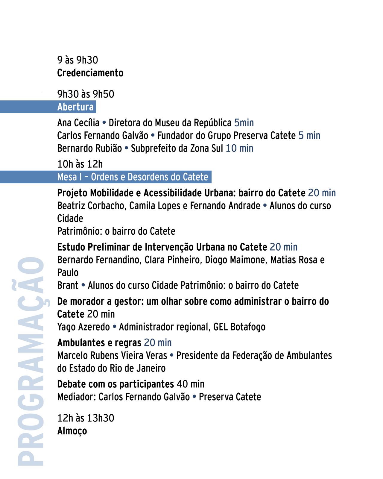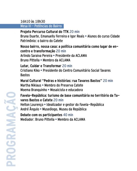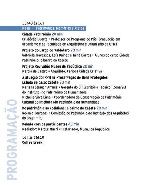 A programação inclui mesas-redondas, apresentações de projetos e debates coletivos, com o objetivo de construir soluções práticas e reunir massa crítica e operacional para que ideias se transformem em ações concretas. A diretora do Museu da República, Ana Cecília Lima; o fundador do Grupo Preserva Catete, Carlos Fernando Galvão, e o subprefeito da Zona Sul, Bernardo Rubião estão entre os palestrantes do evento.