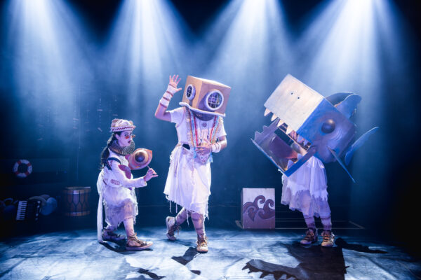 E assim começa a história, através do metateatro, onde o teatro é contado dentro do próprio espetáculo. As crianças são convidadas a subir ao palco, sobre um tapete de linóleo, com giz de cera nas mãos, e começam a desenhar o mar — tudo isso para contar a história.