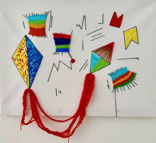 As telas bordadas funcionam como cartografias sensíveis — linhas que se desdobram em rios, raízes, ventres e caminhos internos. Cada ponto é memória pulsante, gesto que sutura o invisível.