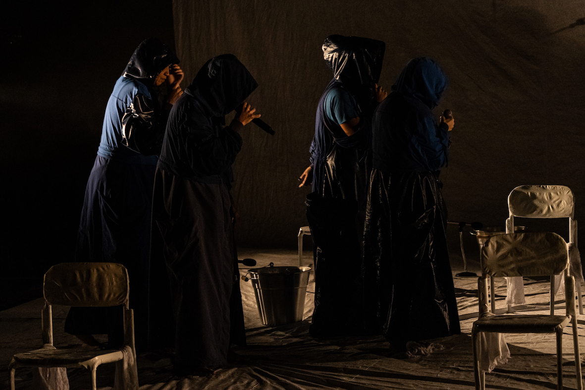 Assim, em “Hip-Hop Blues – Espólio das Águas”, a cena se constrói em fragmentos: chove, os rios transbordam e ocupam São Paulo, reivindicando seus lugares de existência. Em um espaço que remete a um galpão-teatro, artistas refletem, ensaiam e expõem os impasses do presente, em um jogo cênico que fricciona depoimento e ficção. Memorias atravessam a ágora contemporânea, revelando e confrontando estruturas como o racismo, a lgbtqia+fobia, a intolerância religiosa, a supremacia branca e patriarcal, e seus desdobramentos e impacto sobre a realidade cotidiana.