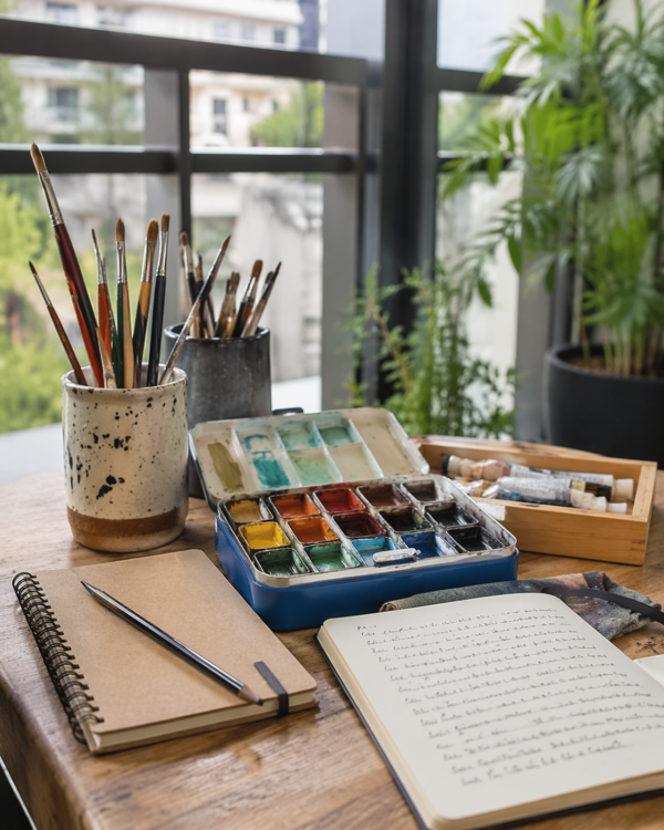 Há um detalhe também. Desde que comprei esse apartamento onde me encontro agora, a varanda meio que tem me convocado à pintura. Descobri que meu vizinho é afeito a esses mesmos sentimentos. Dias desses, em Agosto de 25, fomos eu e Dona Digníssima cortar o cabelo das crianças. Do Théo seria a primeira vez. No local, um shopping, há algumas lojas e papelarias que têm esse material para pintura à venda. Ver meu mais novo zanzando por entre elas e o meu do meio cuidando do mais novo me trouxe ainda mais esse desejo pela pintura.