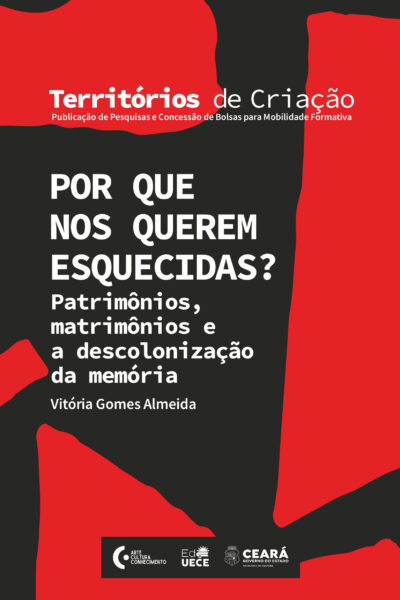 Resultado da tese de doutorado e com atualizações de pesquisas feitas nos últimos três anos, Vitória Gomes lança “Por que nos querem esquecidas? Patrimônios, matrimônios e a descolonização da memória” (Editora da Universidade Estadual do Ceará, 2025, 290 págs.), obra que mergulha nas relações entre gênero, memória e colonialidade, propondo uma reflexão urgente sobre como as estruturas de poder têm perpetuado esquecimentos sistemáticos das mulheres, especialmente negras, indígenas, periféricas, LGBTQIA+ e com deficiências. O livro integra a Coleção Territórios de Criação, fruto do edital da Secretaria da Cultura do Ceará realizado via Lei Paulo Gustavo.
