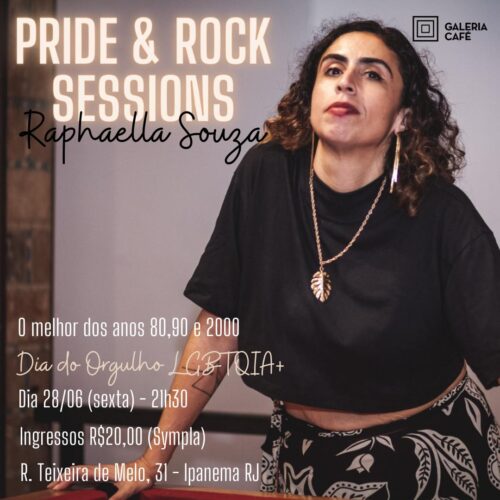 Raphaella Souza apresenta o show Pride & Rock Sessions, no Dia do Orgulho LGBTQIA+, 28 de junho, no Galeria Café Rio, para celebrar a diversidade, a inclusão e a representatividade, com um repertório que traz artistas nacionais e internacionais dos anos 80, 90 e 2000, em sua maioria que atuam como vozes de comunidade, cantando toda forma de amor.