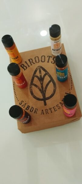Aqui, fiz meu primeiro tour mais detalhado. Minha primeira parada – será que foi a pimenta quem me atraiu? – foi na BIROOTS – SABOR MULTICULTURAL (@biroots_brasil), que quer dizer be=ser/estar – roots=raízes, ou seja, é uma “marca inspirada pela engenhosidade das antigas civilizações e pela mistura de aromas, cores, culturas e sabores dos povos originários e dos que vieram a seguir”.