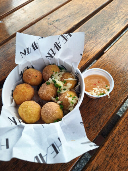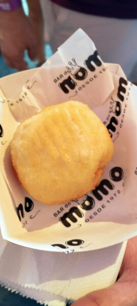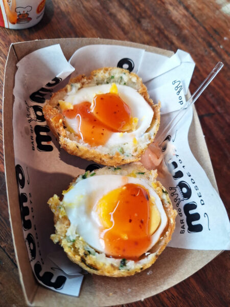 Seguindo mais adiante, entramos na Tenda Parque Lage, onde ficam os restaurantes: Barsa, Curadoria, Mar do Momo, Dom Costela e Bar da Frente. O escolhido aqui foi o BAR DO MOMO (@bardomomooficial), com um bolinho de aipim com camarão e catupiry e um bolovo com gema mole envolto em massa de bolinho de bacalhau.