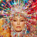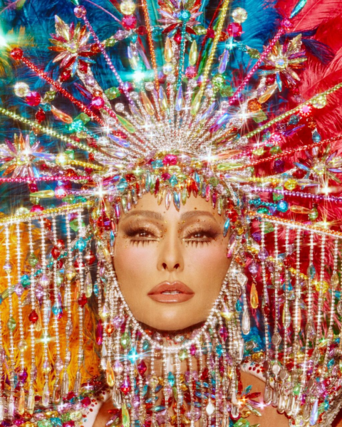 A grandiosidade do figurino começou ainda no backstage. Sabrina levou cerca de 30 minutos para vestir a fantasia, que pesava aproximadamente 40 quilos e reunia mais de 10 mil cristais aplicados manualmente. O resultado foi um verdadeiro delírio cromático. Plumas monumentais em blocos de vermelho, verde, azul, amarelo e roxo criaram uma composição que remetia diretamente às pinceladas intensas e populares de Heitor. O costeiro funcionou como uma paleta aberta, enquanto o body, cravejado e pedrarias multicoloridas aplicadas como respingos de tinta, desenhou o corpo como se fosse a própria tela. No alto, o headpiece se destacou como uma obra à parte em uma coroa solar de cristais e gotas translúcidas que escorriam pelo rosto como fios de tinta líquida, criando um efeito de movimento constante. As franjas de pedrarias que emolduraram o rosto reforçaram a ideia de aquarela em fluxo, como se a arte estivesse viva e pulsando na avenida.