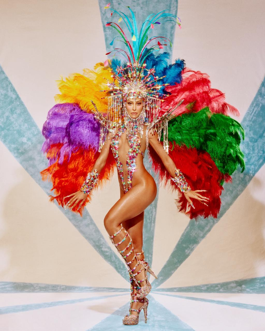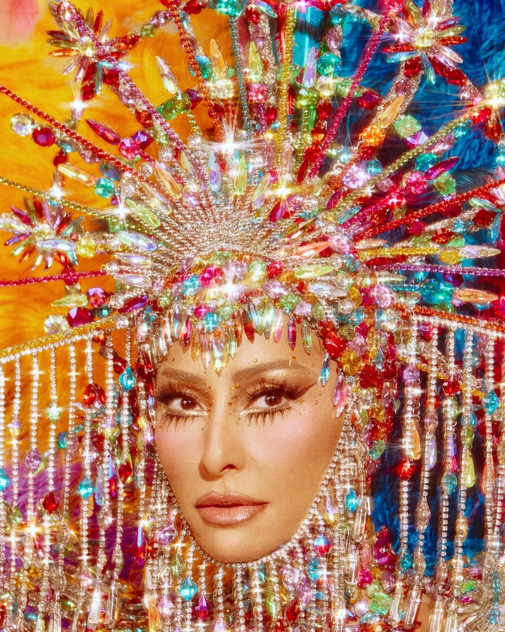 A grandiosidade do figurino começou ainda no backstage. Sabrina levou cerca de 30 minutos para vestir a fantasia, que pesava aproximadamente 40 quilos e reunia mais de 10 mil cristais aplicados manualmente. O resultado foi um verdadeiro delírio cromático. Plumas monumentais em blocos de vermelho, verde, azul, amarelo e roxo criaram uma composição que remetia diretamente às pinceladas intensas e populares de Heitor. O costeiro funcionou como uma paleta aberta, enquanto o body, cravejado e pedrarias multicoloridas aplicadas como respingos de tinta, desenhou o corpo como se fosse a própria tela. No alto, o headpiece se destacou como uma obra à parte em uma coroa solar de cristais e gotas translúcidas que escorriam pelo rosto como fios de tinta líquida, criando um efeito de movimento constante. As franjas de pedrarias que emolduraram o rosto reforçaram a ideia de aquarela em fluxo, como se a arte estivesse viva e pulsando na avenida.