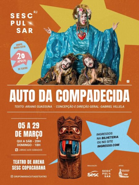 – ATÉ 29 DE MARÇO, “AUTO DA COMPADECIDA”, de ARIANO SUASSUNA. Direção: GABRIEL VILLELA, com o GRUPO MARIA CUTIA, em comemoração aos 20 anos da companhia de Belo Horizonte. Local: Sesc Copacabana. Quinta a sábado, às 20h; domingo, às 18h. R$ 30,00.