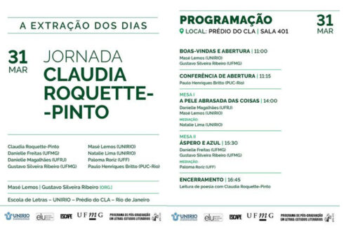 – DIA 31 DE MARÇO, DAS 11h ÀS 17h, “JORNADA CLAUDIA ROQUETTE-PINTO”, uma celebração da poesia dessa grande poeta. Organização: MASÉ LEMOS e GUSTAVO SILVEIRA RIBEIRO. A PROGRAMAÇÃO ENCONTRA-SE NOS CARDS. Local: UNIRIO, prédio do CLA, sala 401. TODOS LÁ!
