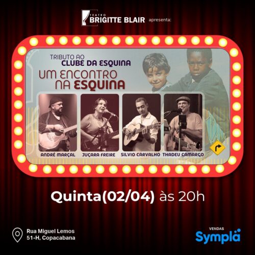 – DIA 02 DE ABRIL, ÀS 20h, “TRIBUTO AO CLUBE DA ESQUINA – UM ENCONTRO NA ESQUINA”, com ANDRÉ MARÇAL, JUÇARA FREIRE, SILVIO CARVALHO e THADEU CAMARGO. Local: Teatro Brigitte Blair, Rua Miguel Lemos 51-H, Copacabana. Vendas Sympla.