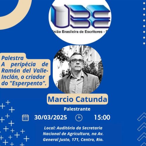 – DIA 30 DE MARÇO, ÀS 15h, “A PERIPÉCIA DE RAMÓN DEL VALLE-INCÁN, O CRIADOR DO “ESPERPENTO””, com MARCIO CATUNDA. Local: Auditório da Secretaria Nacional de Agricultura, Av. General Justo, 171, Centro.