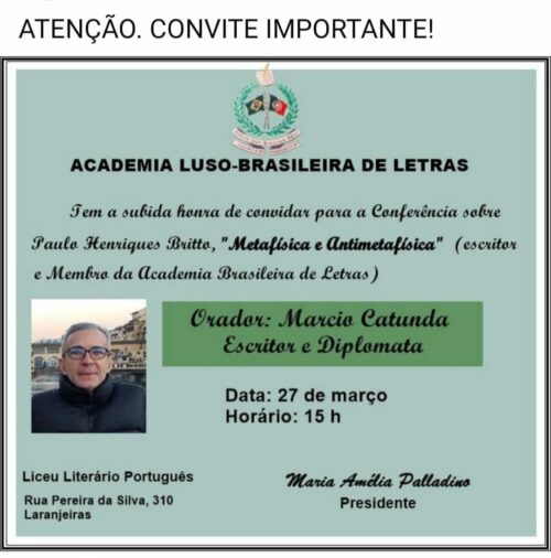 – HOJE, DIA 27 DE MARÇO, ÀS 15h, conferência de MARCIO CATUNDA, escritor e diplomata, sobre o tema “PAULO HENRIQUES BRITTO, METAFÍSICA E AUTOMETAFÍSICA”. Local: Academia Luso-Brasileira de Letras, Liceu Literário Português, Rua Pereira da Silva, 310, Laranjeiras. IMPERDÍVEL!