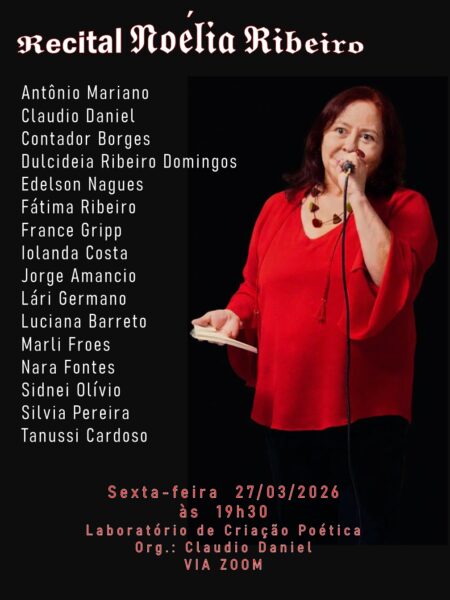 – HOJE, DIA 27 DE MARÇO, ÀS 19h30, “RECITAL NOÉLIA RIBEIRO”, com a participação de vários poetas e amigos, inclusive este que lhes escreve. Organização: CLAUDIO DANIEL. PROGRAMAÇÃO COMPLETA NO CARD. Local: Laboratório de Criação Poética – VIA ZOOM. IMPERDÍVEL!