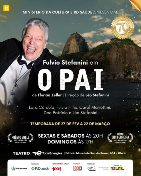 – ATÉ 22 DE MARÇO, “O PAI”, de FLORIAN ZELLER, com FULVIO STEFANINI e LARA CORDULA. Direção: LÉO STEFANINI. Em 2016, a peça ganhou os prêmios SHELL e BIBI FERREIRA, de melhor ator. Local: Teatro TotalEnergies, Glória. Sexta e sábado, às 20h; domingo, às 17h. De R$ 50,00 a R$ 150,00.